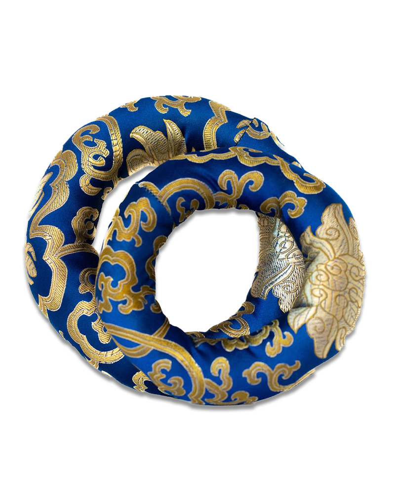 Our beautiful singing bowl cushions feature four vibrant colors. Choose from red/gold, blue/gold, orange/gold, and purple/purple in silky fabric with a dragon brocade design. Handmade in Nepal.